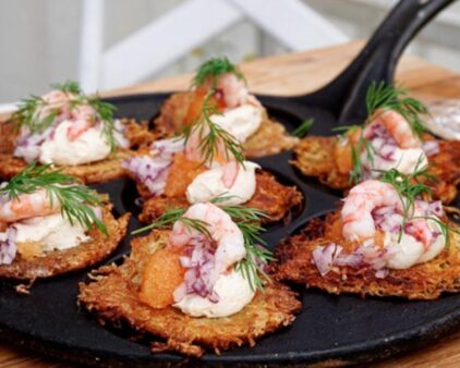Rårakor som toppas med löjrom, smetana, hackad rödlök och räka. Enkelt att göra och smakar himmelskt gott!
