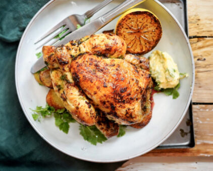 Servera kycklingen med resterande örtsmör och den råstekta potatisen. Pressa över den grillade citronen precis innan servering!