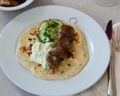 Saftiga lammspett på hemgjorda flatbread med krämig fetaoströra och syrlig gurka – en smakrik middag med influenser från Medelhavet. Perfekt att bjuda på till helgen eller när du vill lyxa till vardagen!