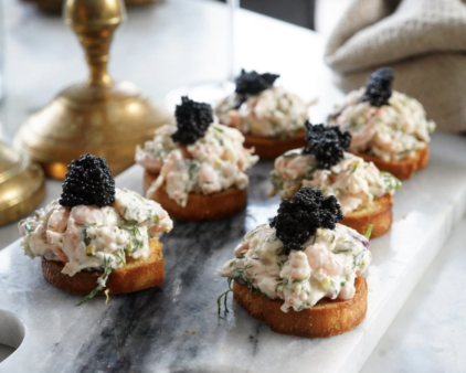 Krispiga crostini toppade med en krämig räkröra smaksatt med citron, dill, dijon och pepparrot – avslutade med rom för maximal lyx. Perfekt som förrätt, till fördrink eller när du vill imponera utan krångel.