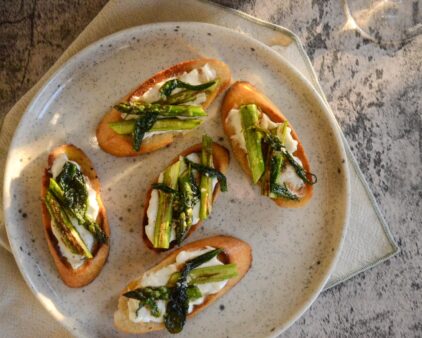 Ett tilltugg som är enkelt att laga och oerhört gott – utmärkt tillsammans med ett glas mousserande vin! Vinets bubblor och syra möter möter upp rättens feta inslag på ett utmärkt vis samtidigt som den generösa fruktigheten samspelar med sparrisens och ramslökens gröna toner!