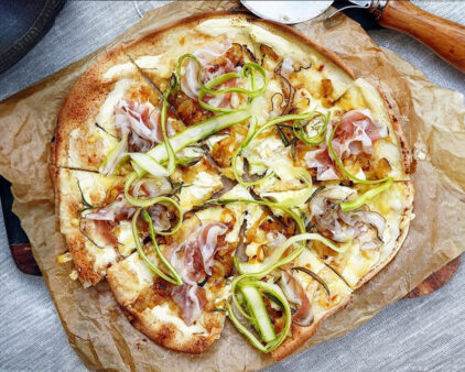 Libapizza med creme fraiche, prästost, karamelliserad lök, rosmarin och chevre toppad med pancetta och krispig sparris. När du är i tidsnöd är detta det perfekta sättet att stilla ditt pizzabegär! Den här rätten behöver inga egentliga mått utan du toppar med det du gillar och i den mängden du önskar.